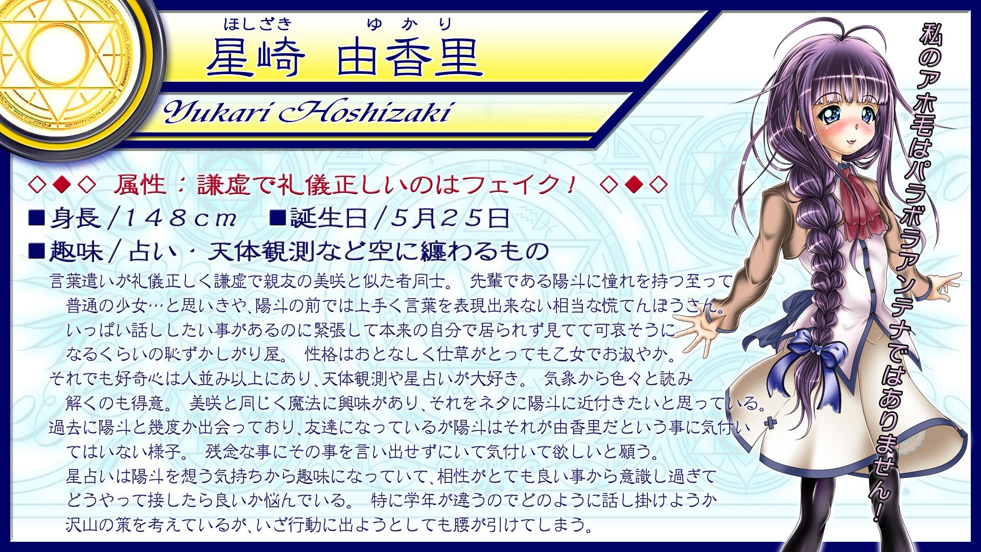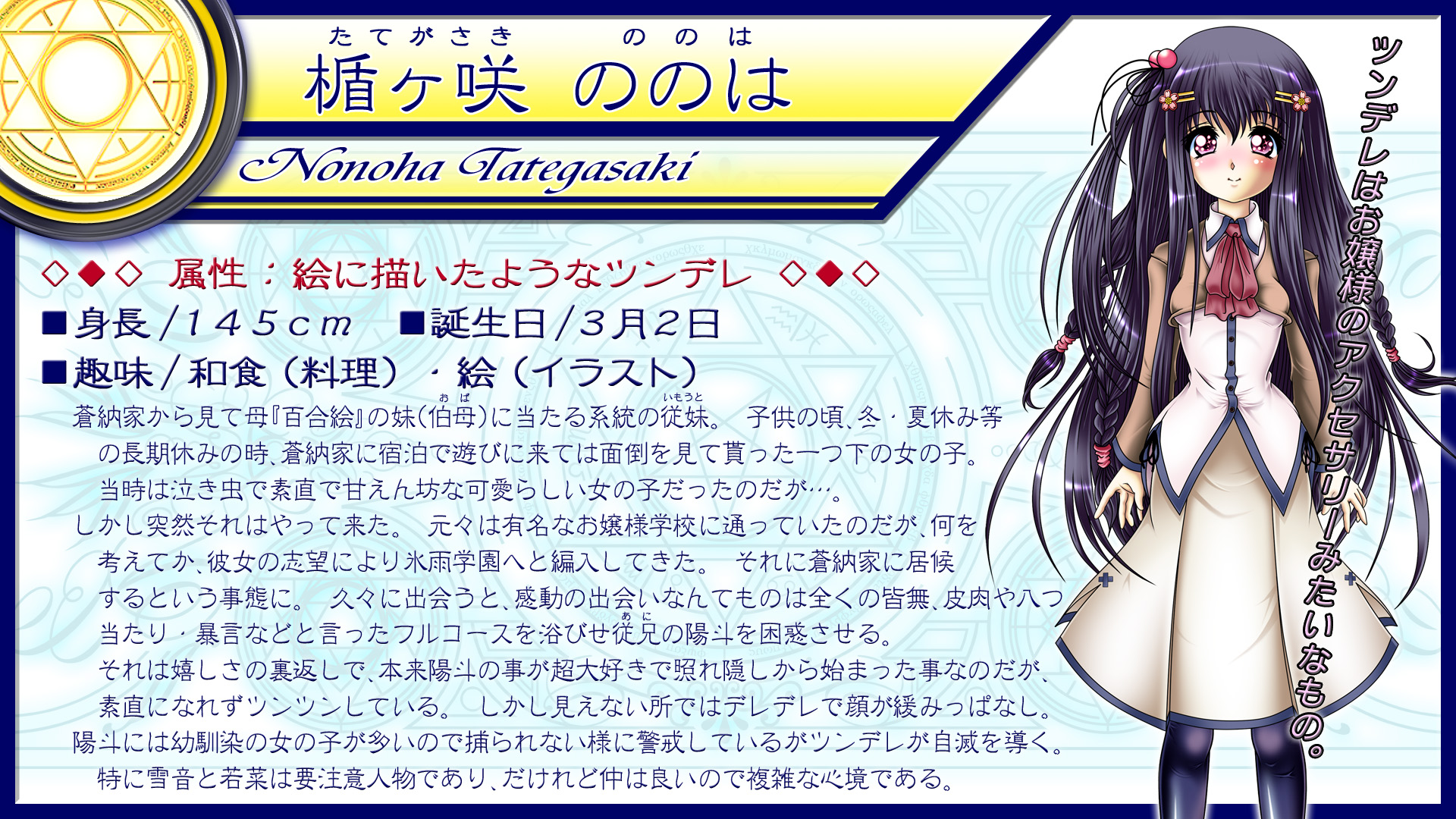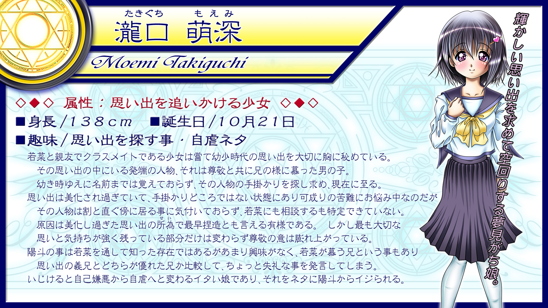 2010年にリリースした『蒼き記憶』の続編であり都合上、制作休止していたプロジェクトを只今進行中。 拘りのあまりキャラ数がとんでもない事になっており、なかなか進んでおりません!! 無料配布を検討しているのにも拘らず内容も長くなる予定です。
